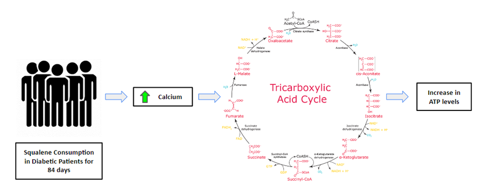 Conclusion: Based on the findings of this study, the addition of various doses of squalene to a diabetic patient's diet increases the amount of calcium found in their metabolic process in relation to the Krebs cycle. As calcium is responsible for stimulating the Krebs Cycle, it is evident that squalene plays an important part in ATP production.
