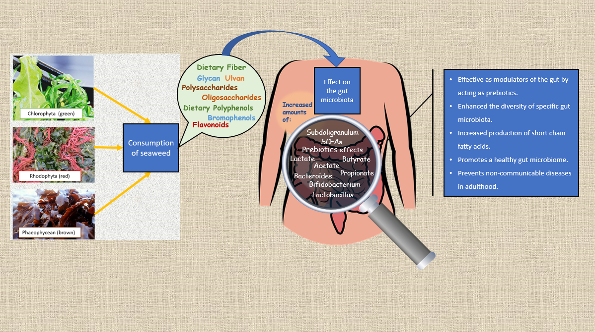 The human gut microbiota is dominated by bacteria, and the host dietary intake is one factor that can modulate the diversity of the gut microbiota to health or diseases. According to the FAO, there is an annual steady decline in agricultural practices of over one percent. There has been an anticipation that algae production will be increased to supplement the use of vegetables from terrestrial land. Seaweed is a sustainable crop that offers a rich source of bioactive compounds, yet its potential is not fully exploited. Seaweeds) has been part of the staple diets of East Asian populations for a long time, and their bioactive compounds have the potential to be functional foods. As such, it has become pertinent to explore how seaweed can modulate gut microbial composition and function to improve host health. The purpose of the study is to conduct an extensive literature review to ascertain what is known about the effects of seaweed on the microbiota. A systematic search was conducted using relevant databases to find studies looking at the effects of green seaweed on the microbiota. From all 8,951 search results, 7 publications were included in this systematic review. The result showed that seaweed has a prebiotic effect in vitro digestive systems and a significant increase in SCFA production. Studies indicated that oligosaccharides and polysaccharides gotten from seaweed can regulate intestinal metabolism and could manage inflammatory bowel disease. The results of this review showed that consumption of seaweed is beneficial to the host and the gut microbiota.