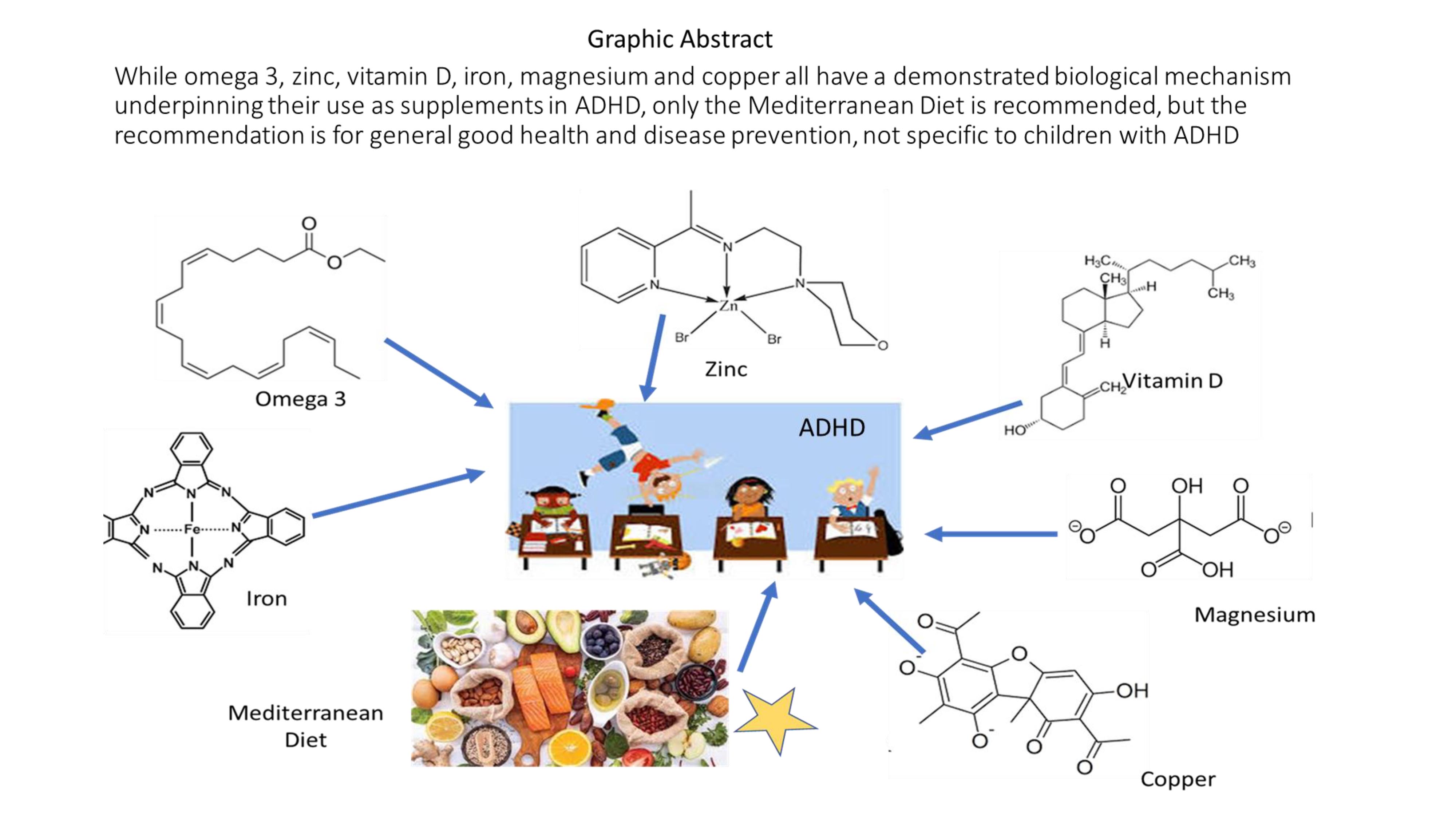Conclusions: Professional bodies do not recommend these interventions for the general ADHD population in the absence of documented deficiencies. Because the Mediterranean diet prevents chronic disease and promotes general health and wellness, it can be recommended as appropriate for children with ADHD.