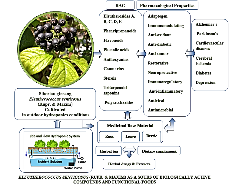 Conclusion: According to the results of a phytochemical study of E. senticosus leaves grown in outdoor hydroponics and soil culture in the Ararat Valley, the highest content of biologically active compounds (eleutherosides, phenols, phenolic acids, vitamins) is recorded in hydroponic plants in the flowering period. In general, the research has practical importance,since the E. senticosus plants grown in hydroponic conditions can be a rich source for the production of natural food and dietary supplements.